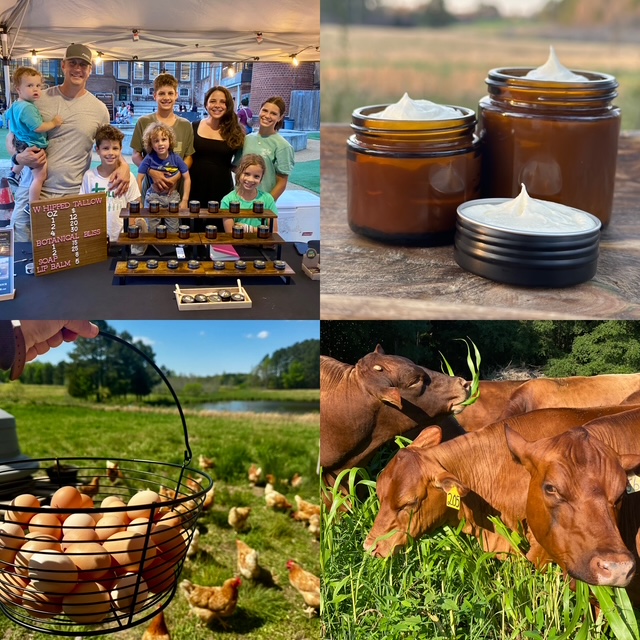 The Fatted Calf – Oxford, NC – At The Fatted Calf Ranch, we raise all of our animals on pasture using regenerative, rotational grazing practices that restore the land and produce nutrient-dense food. Our cattle are 100% grass-fed and grass-finished, and our hens roam freely on open pasture to lay rich, flavorful eggs. We also craft small-batch tallow skincare using tallow from our own grass-fed and grass-finished cattle as well as other local, trusted farmers – a natural, sustainable way to nourish your skin from the farm.